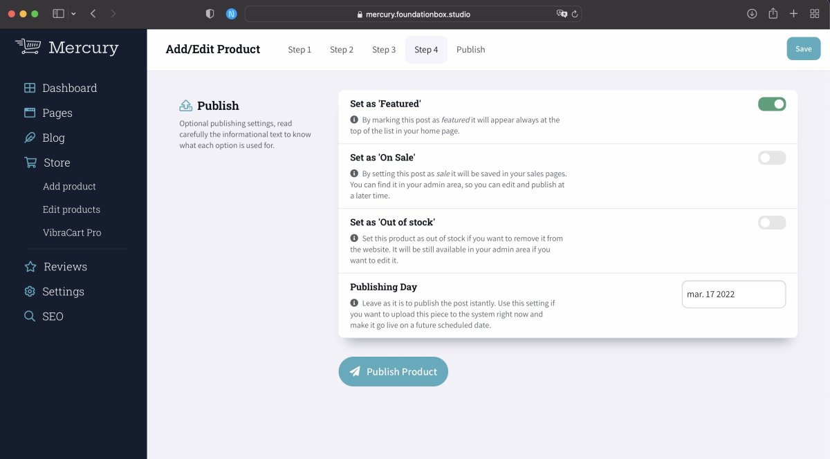 After you followed the publishing instruction in the admin area dashboard (Check publishing instructions here) and you went through your Vibracart control panel as described here. You are ready to create your first product.